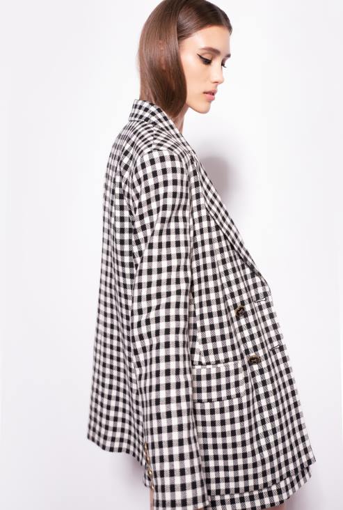 класични блејзер од растегљиве тканине од мешавине памука, вуне и вискозе са двобојним мотивом гингхам. крагна са ревером, дуги рукави и џепови са преклопом са стране. памучна унутрашња облога. дупло копчање са дугмадима прилагођеним логотипом љубавних птица.
