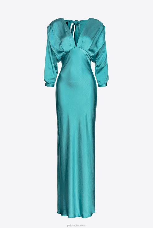 дуга, елегантна сатенска хаљина са благо лабавим горњим делом, дубоким деколтеом напред, три рукава до четврт дужине и кључаоницом са дугим краватама које се позади везују у машну. царски струк и дуга, течна и женствена сукња. - модел је висок 176 цм и носи величину 40.