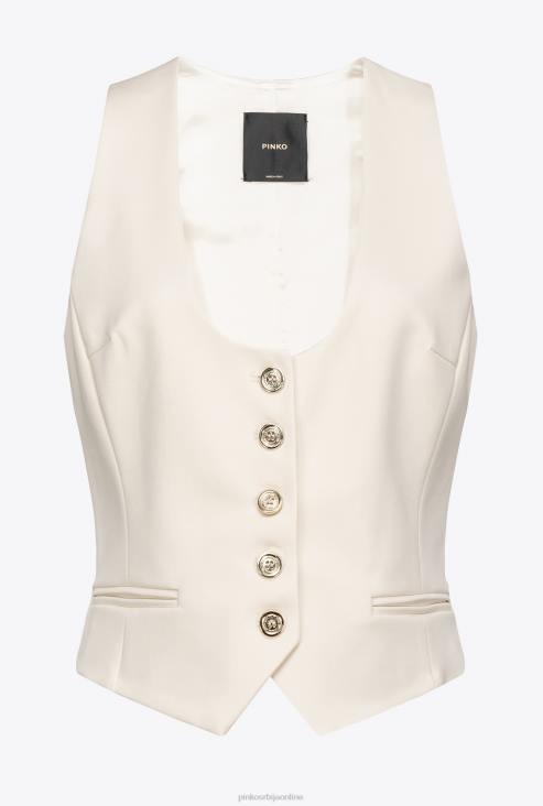 кратак прслук од растезљиве техничке вискозне тканине са карактеристичним пуним милано плетенином са ефектом роњења. дубоки изрез и бочни џепови са двоструким преливом. златна метална дугмад. - модел је висок 175 цм и носи величину 40.