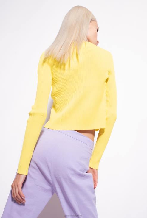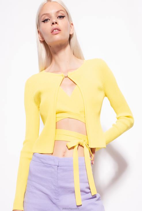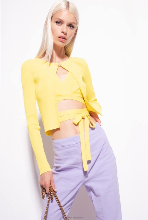 кратак кардиган танког кроја од растезљивог вискозног креп плетеног ребра. округли врат причвршћен малом металном куком прилагођеном логотипом љубавних птица. - модел је висок 175 цм и носи величину 40.