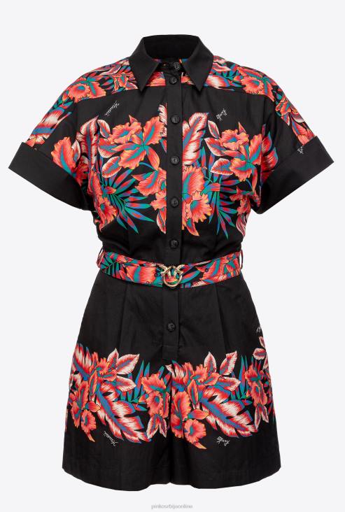 Одело за игру од памучног поплина са тропским принтом на црној позадини. крагна кошуље, кратки рукави и одговарајући каиш од исте тканине са металном мини копчом за љубавне птице. пуне шорц са стрелицама и бочним џеповима. копчање на предњу дугмад. - модел је висок 177 цм и носи величину 40.
