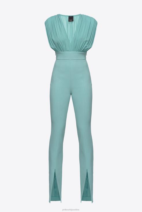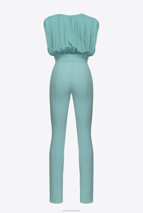 комбинезон без рукава са растезљивим џоржетом стезником са ефектом драпеда и В-изрезом напред. уске панталоне високог струка од техничког растезљивог креп материјала са прорезом у средини на дну ногавица. невидљиви патент затварач са обе стране. - модел је висок 177 цм и носи величину 40.
