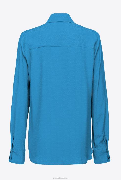 кошуља од свиленог креп де шина тканог жакарда, са мотивом логотипа по целој површини. класична крагна и лабави, пуни рукави. копчање на предњу дугмад.
