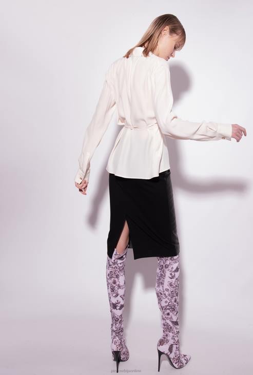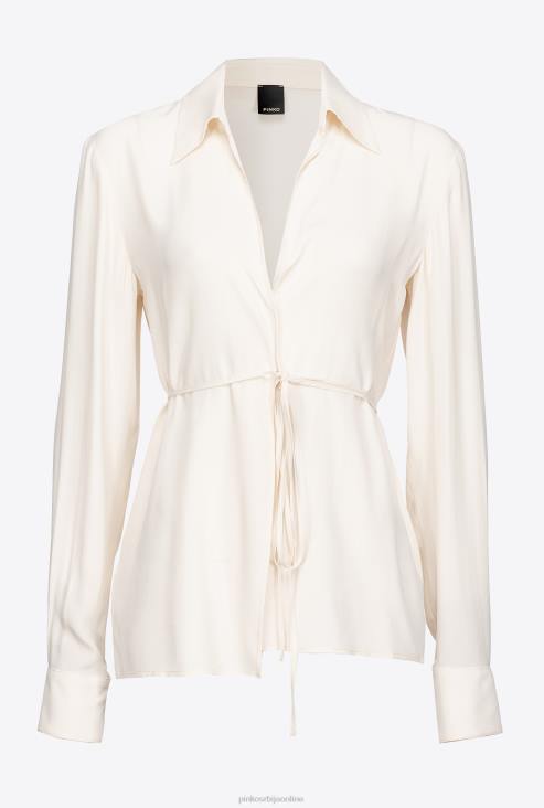 женствена кошуља од креп де шина од мешавине свиле. шиљата крагна са В-изрезом и дугим рукавима са манжетном украшеном драгуљима. везан краватом у струку. овај комад је направљен од материјала - сертификованог у целом производном ланцу - из шума којима се газдује у складу са принципима одрживости.