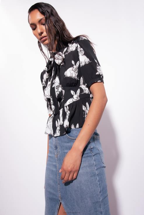 кратка, вискозна креп де шина кошуља са штампом зеца. ребрасти изрез, благо надуване кратке рукаве и ушивен струк у стилу груди. копчање на предњу дугмад.