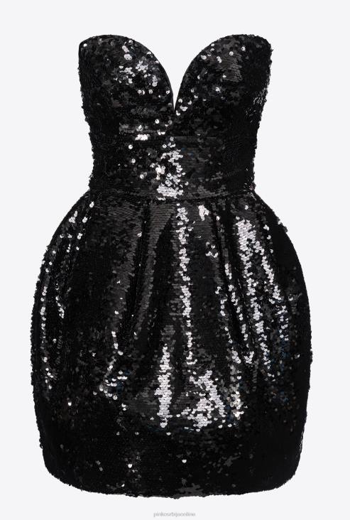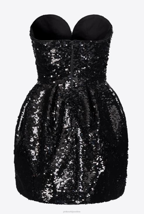 кратка хаљина без рукава од црне тканине пуне шљокицама са посебним гламурозно тамним ефектом. стезник без бретела са драгим изрезом је опремљен и ојачан контурираном доњом жицом која одваја дизајн, истовремено стварајући обрнуте наборе и наборе који формирају балон сукњу са уметком у струку. подстављен модел. скривени централни патент затварач на леђима. одећа је део специјалне колекције капсула ограниченог издања која обухвата ексклузивне моделе ограниченог издања пинко галерије.