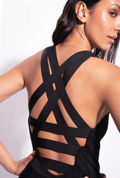 кратка хаљина без рукава од растезљиве плетене вискозе са специјалном сјајном завршном обрадом. четвртасти изрез напред, детаљ драгуља на једном рамену и отворена леђа са вишеструким укрштеним тракама. благо надувена сукња карактерише деликатан набор. - модел је висок 178 цм и носи величину 40.