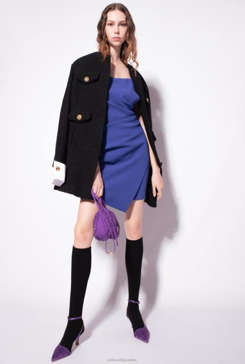 кратка хаљина без рукава равног кроја од растегљиве креп тканине, са ефектом драпа на предњој страни. танке нараменице, драги деколте напред, раван изрез позади и кратка сукња са ефектом омота. патент затварач на средини позади.