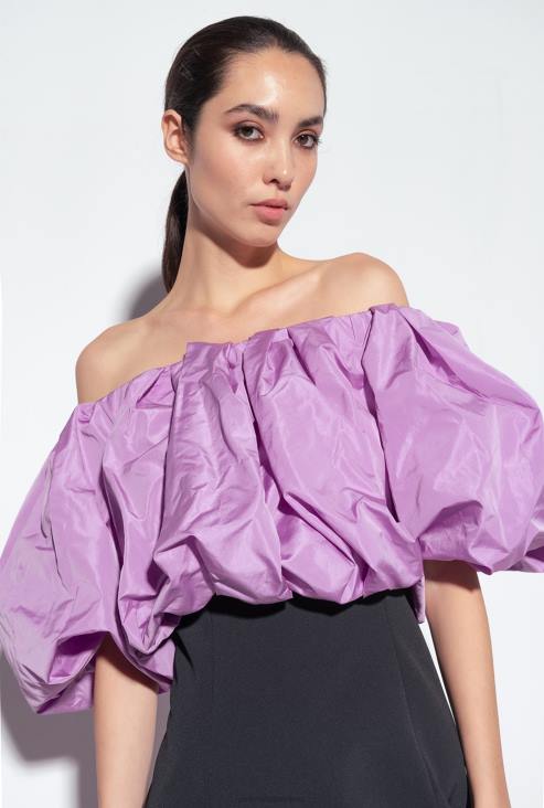 уска кратка хаљина од растезљиве креп тканине са обимним горњим делом од тафта. ова тканина која подсећа на цоутуре привлачност је дизајнирана да створи елегантне, упечатљиве и скулптуралне силуете: тафт на додир има исти изглед и на предњој и на доњој страни, а посебно је погодан за наглашавање волумена. Горњи део од тафта у контрастној боји има изрез отворених рамена и балон крој, поред уског кроја скраћеног доњег дела који се закопчава помоћу рајсфершлуса у средини. одећа је део специјалне колекције капсула ограниченог издања која обухвата ексклузивне моделе ограниченог издања пинко галерије.