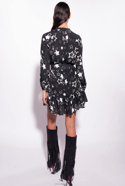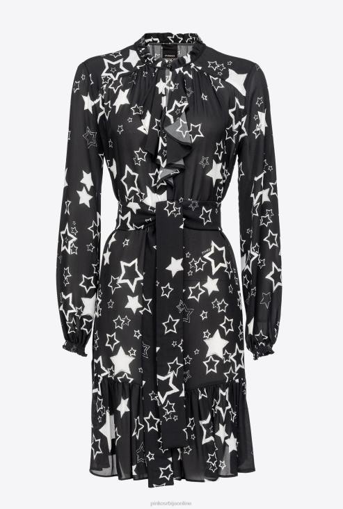 кратка хаљина од креп де шина са штампом звезда по целом делу. округли изрез са кључаоницом која се копча малим дугметом на предњој страни, детаљом од волана, дугим рукавима са малом еластичном манжетном и краватом у струку од одговарајуће тканине. широка сукња са воланом на дну.