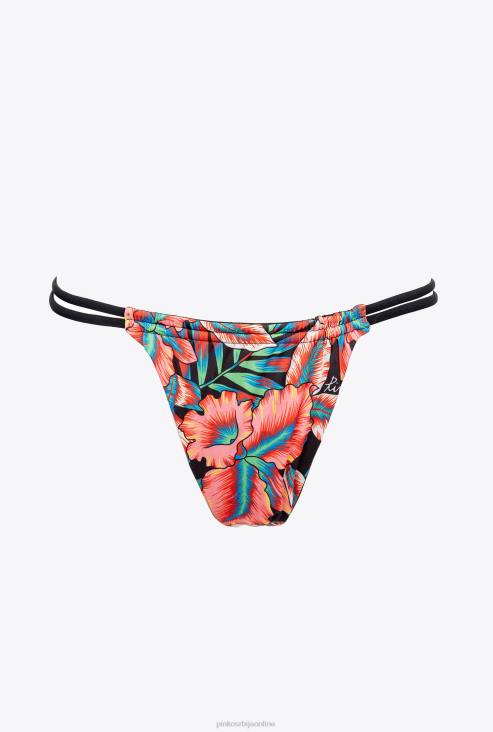 Технички растезљиви бикини доњи део са тропским принтом и црном позадином. пар високог струка са високо изрезаним ногавицама, са стране са двоструким каишевима и одштампаним розе логотипом на леђима. - модел је висок 178 цм и носи величину 40.