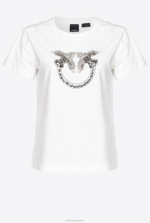 мајица кратких рукава од памучног дреса са великим драгуљима извезеним логотипом љубавних птица на предњој страни. - модел је висок 175 цм и носи величину 40.