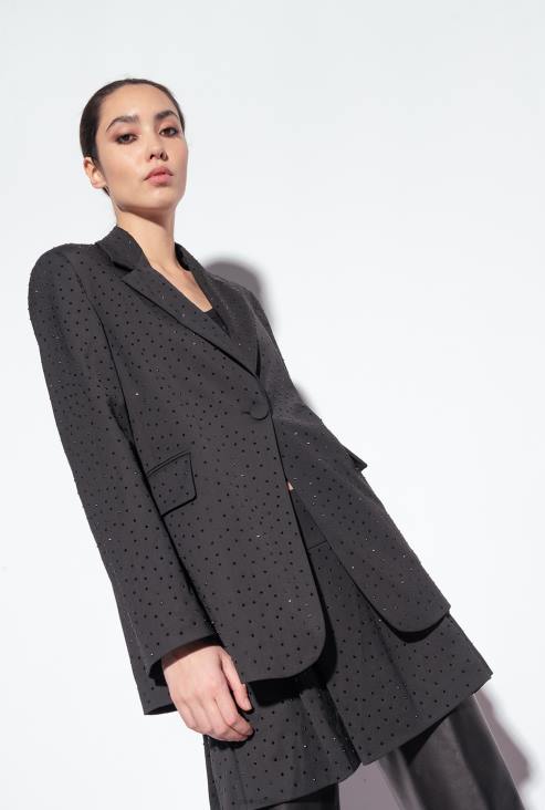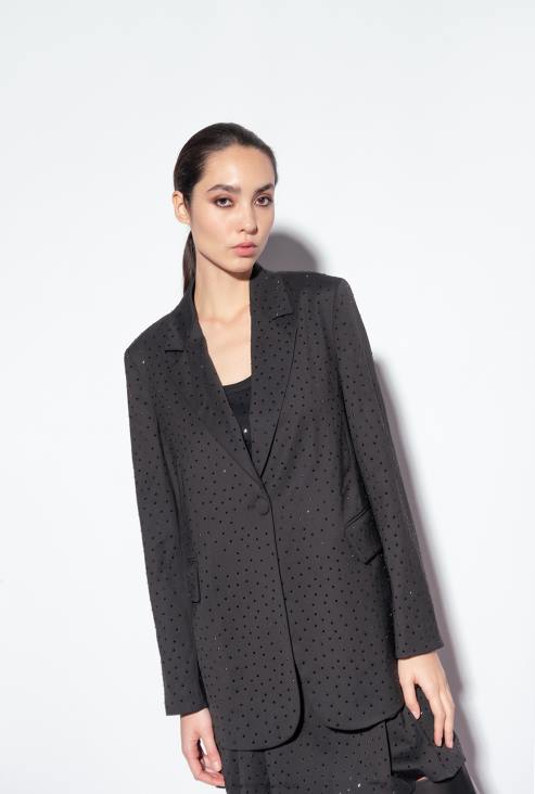 благо предимензионирани блејзер равног кроја у стилу дечка од благо растезљиве техничке вунене тканине са апликацијама од рхинестона који се преносе топлотом испрекиданим по целој предњој и задњој страни одеће. дијаманти у одговарајућим бојама су редовно постављени преко дизајна како би се створио посебан луксузни ефекат. крагна са ревером, конструисана рамена, лабави рукави, бочни џепови украшени преклопом и централни задњи вентил. унутрашњост обложена тканином и једноструко копчање које се састоји од једног дугмета обложеног тканином. одећа је део специјалне колекције капсула ограниченог издања која обухвата ексклузивне моделе ограниченог издања пинко галерије.