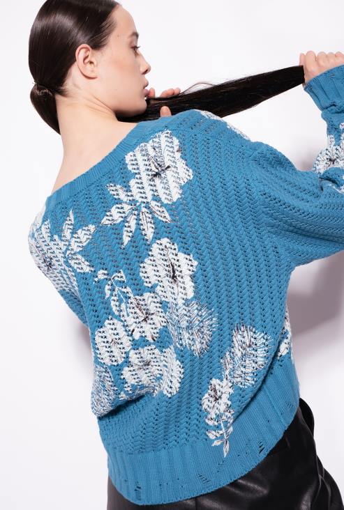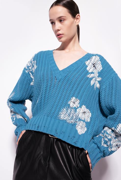 пуловер опуштеног кроја од пола рибарског плетеног памука са графичким цветним принтом. В-изрез и дуги ниски увучени рукави. - модел је висок 175 цм и носи величину 40.