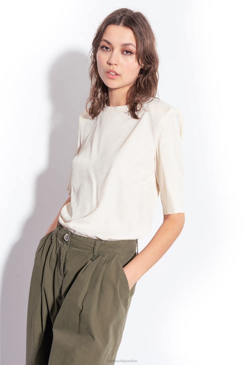 блуза од креп де шина од мешавине свиле са узорком логотипа од жакарда. равног кроја са округлим изрезом, кратким рукавима са структурираним раменима и копчањем на кључаоницу са малом кукицом у средини позади.