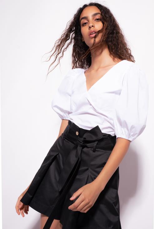 Блуза правог кроја од растегљивог памучног поплина са В-изрезом и полупуф рукавима са еластичним рубом. - модел је висок 175 цм и носи величину 40.