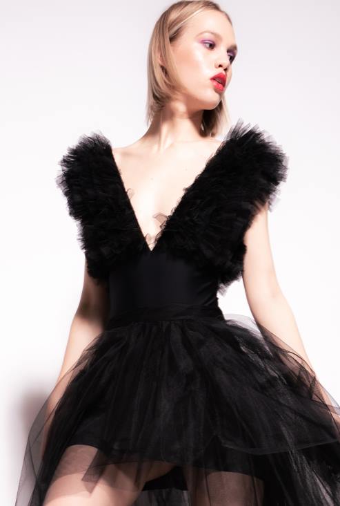 боди од растегљиве тканине без рукава са украсним рушима од тила тон у тон. урањајући В-изрез напред и назад. - модел је висок 179 цм и носи величину 40.