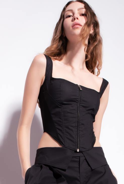 топ без рукава од памучног поплина и техничког растезљивог материјала. прави изрез напред и позади, нараменице и шиљасти поруб. метални патент затварач на предњој страни.