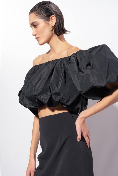 обимни тафт топ са изрезом отворених рамена, танким нараменицама и кратким макси рукавима. постројени. - модел је висок 177 цм и носи величину 40.
