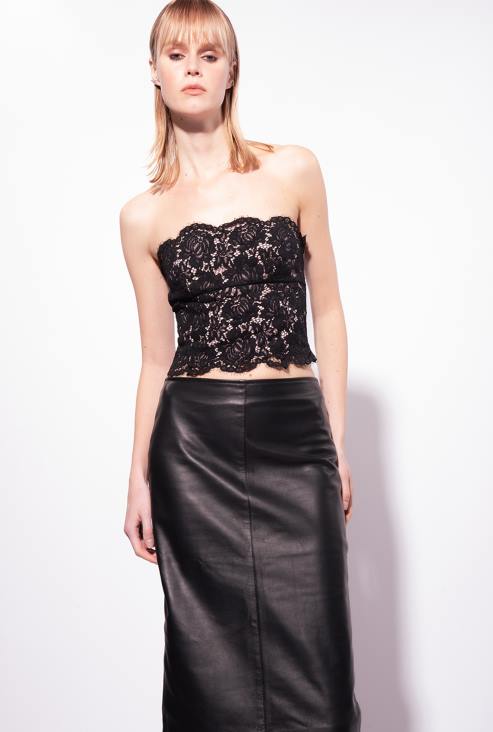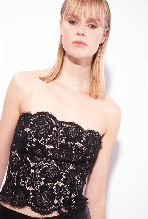 Цроп топ без рукава у стилу бустиера од везене чипке. комад без рукава са назубљеним ивицама. облога од тканине. скривени централни патент затварач на леђима.