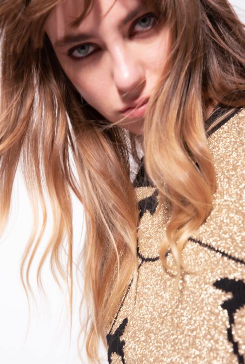 скраћени џемпер од памука и лурекс жакарда, са мотивом монограма макси љубавних птица. округлог врата и кратких рукава.