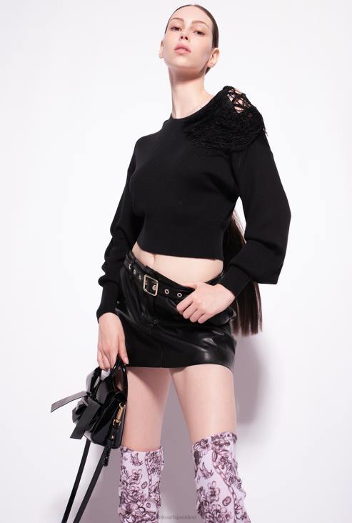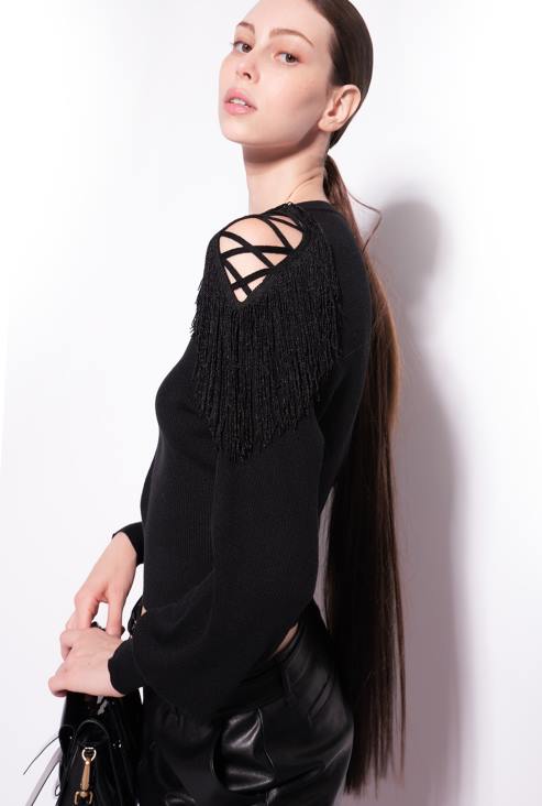 плетени пуловер од вискозе и кашмира. округли изрез, дуги балон рукави и уклопљен струк. једно раме је украшено исеченим детаљима, пертлама и ресама тон у тон. - модел је висок 178 цм и носи величину 40.