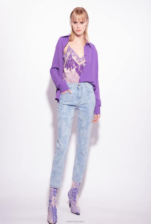 уске фармерке са пет џепова од тексаса са ефектом мермера, са апликацијом од провидног дијаманта на предњој страни. висок струк са омчама за каиш и равним, удобним ногама. метални патент затварач и копчање на дугмад.