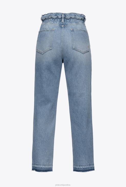 фармерке са пет џепова у стилу мама-фит у старинском тексасу. висок струк са омчама за каиш, еластичном траком и скупом позади и танким каишем од одговарајуће тканине са мини металном копчом у облику птица. равне ногавице које су при дну мало затегнуте, са сирово резаним порубом. метални патент затварач и дугмад.