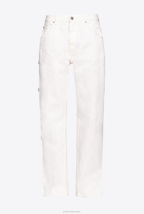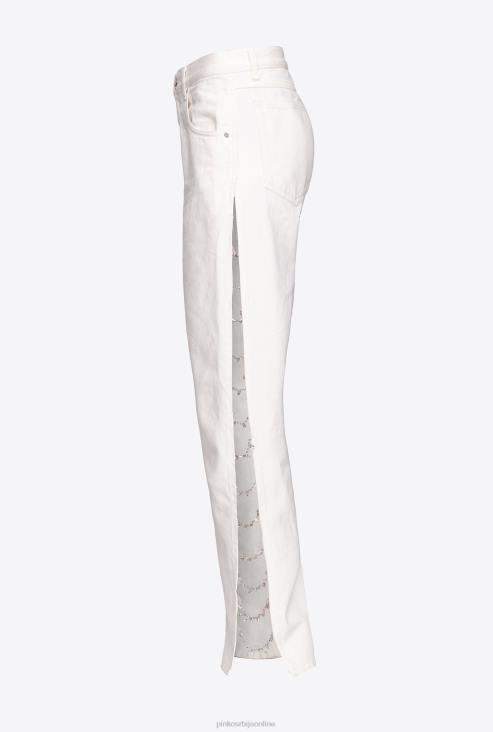 панталоне правог кроја са пет џепова од памучне деним тканине. висок струк, детаљ омче за каиш и широки бочни прорез, употпуњен префињеним уметнутим ручно ушивеним ланцима од рхинестона. метални патент затварач и копчање на дугмад. одећа је део специјалне колекције капсула ограниченог издања која обухвата ексклузивне моделе ограниченог издања пинко галерије.
