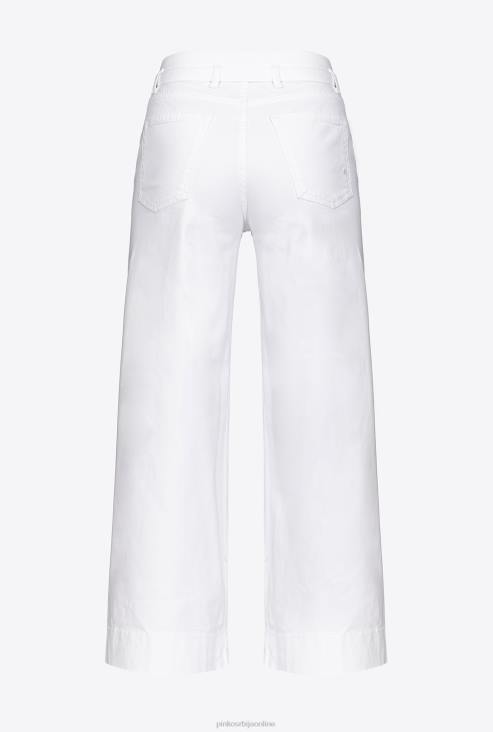 расширене панталоне од растезљивог памучног габардина. обичан струк са омчама за каиш и танак каиш од одговарајуће тканине са мини металном копчом за птице. коси предњи џепови, џепови са закрпама позади и благо широке подрезане ноге које се шире на дну. копчање на патент затварач и дугмад.