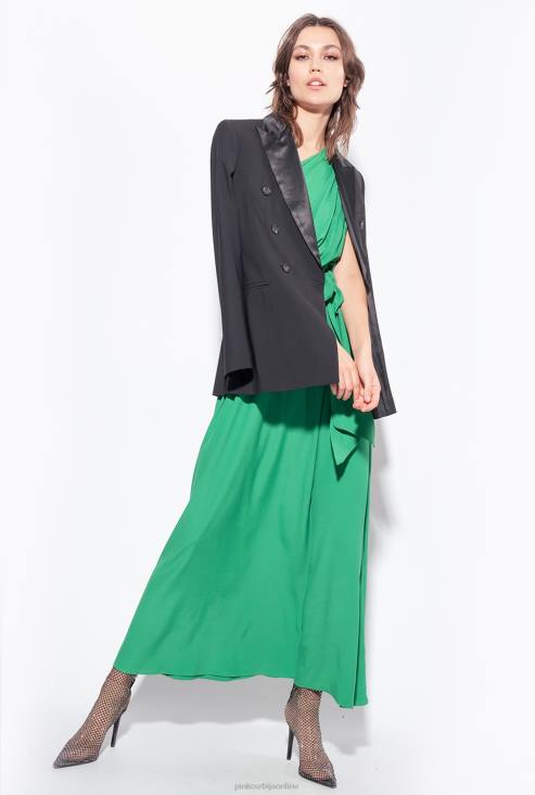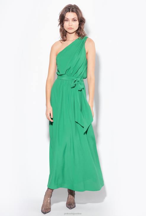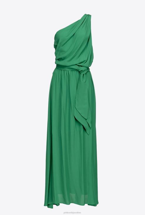 дуга хаљина на једно раме од вискозног креп марокаина. стезник слободног кроја са драпијом на леђима и сукња равног кроја са деликатним плисирањем. комплетан са одговарајућим каишем од исте тканине, који се веже у струку.