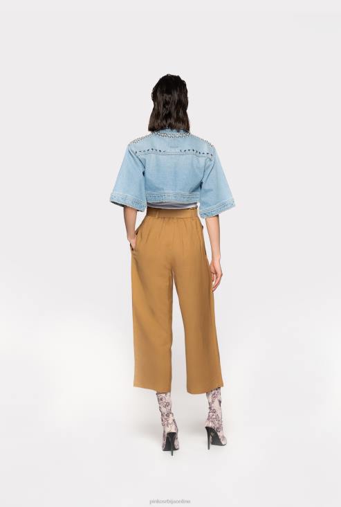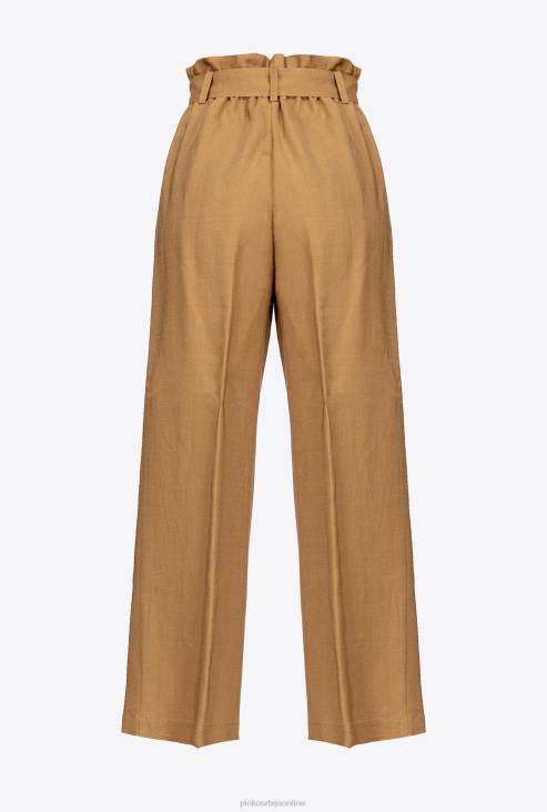 панталоне широких ногавица од течне тканине од мешавине лана и вискозе, са каишем за везивање од одговарајуће тканине. висок струк са стрелицама и бочним џеповима. патент затварач и дугмад.