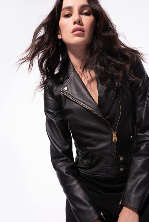 бајкерска јакна од напа коже, са металним дугмадима на врату. џепови са металним патент затварачем, језичци са дугметом на дну и рукави са патент затварачем и језичком на крају. облога од тканине. асиметрично копчање на патент затварач.