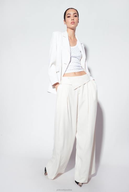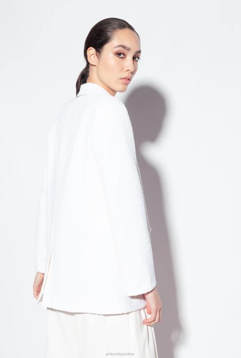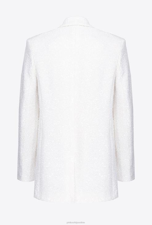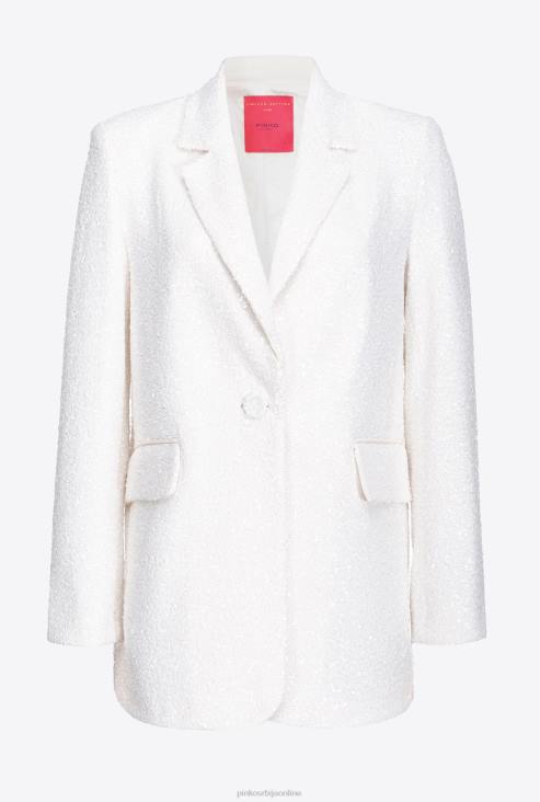 благо предимензиониран, равно кројен сако у дечко стилу од беле тканине са везеним шљокицама са посебним сјајним ефектом. крагна са ревером, конструисана рамена, лабави рукави, бочни џепови украшени преклопом и централни задњи вентил. унутрашњост обложена тканином и једноструко копчање на једно дугме. одећа је део специјалне колекције капсула ограниченог издања која обухвата ексклузивне моделе ограниченог издања пинко галерије.